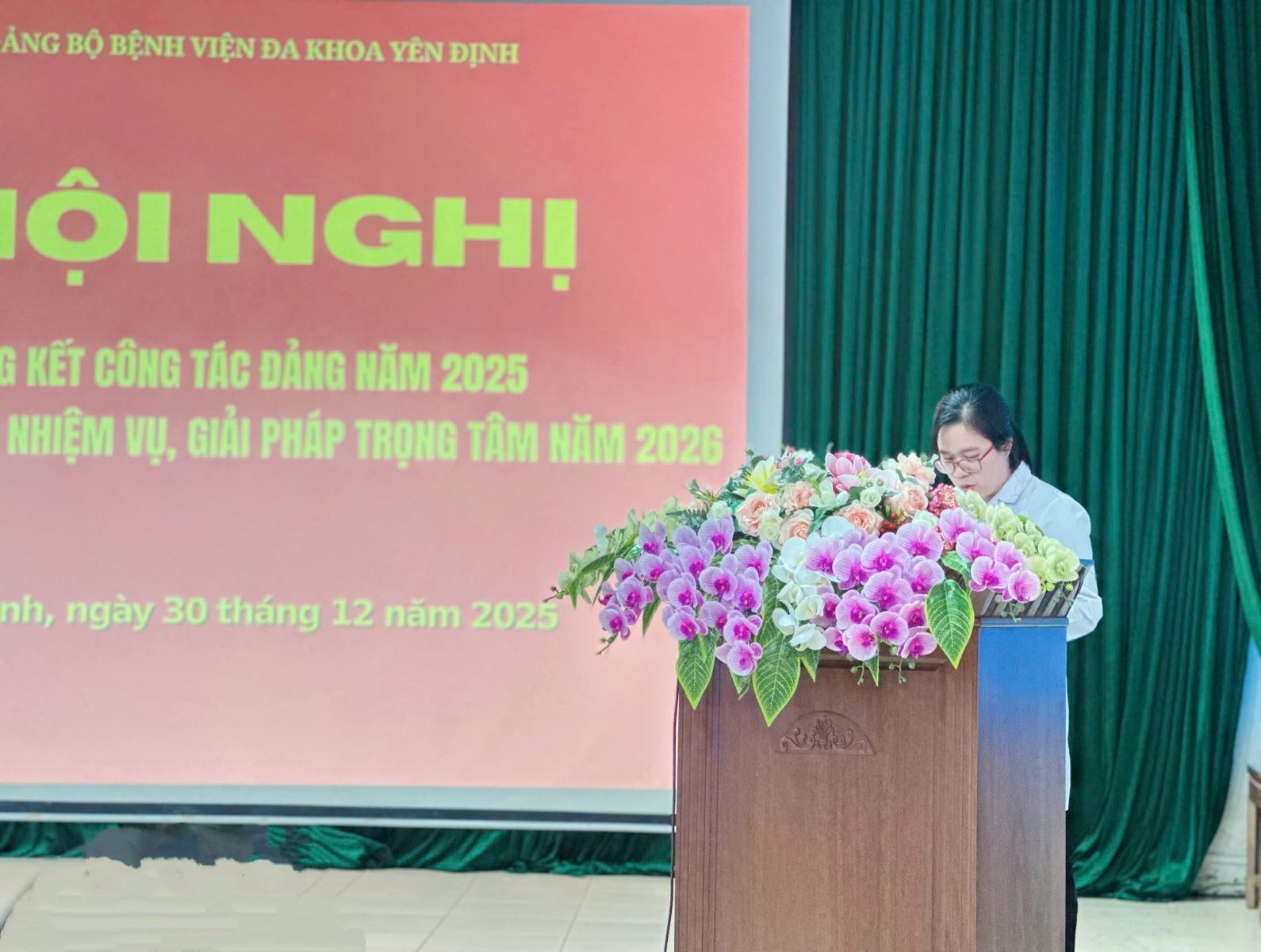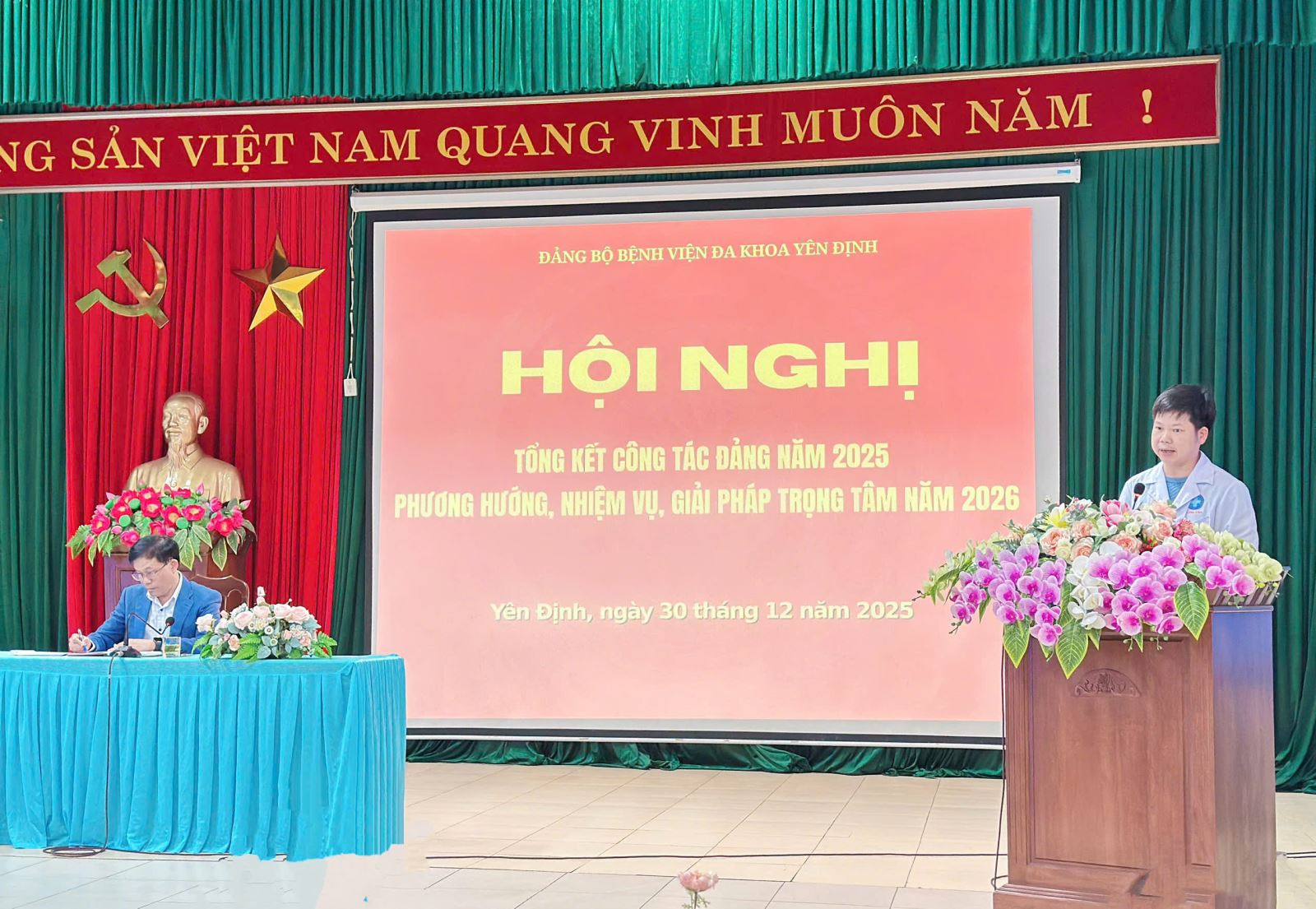 Tại hội nghị, Đ/c Nguyễn Danh Lâm-Phó bí thư Đảng uỷ, Phó Giám đốc Bệnh viện đã trình bày tóm tắt báo cáo tổng kết công tác xây dựng Đảng năm 2025. Năm 2025, trong bối cảnh đất nước và ngành Y tế triển khai nhiều chủ trương lớn về tinh gọn tổ chức bộ máy, đổi mới mô hình quản trị và nâng cao chất lượng dịch vụ y tế, Đảng bộ Bệnh viện Đa khoa Yên Định đã phát huy tốt vai trò hạt nhân chính trị, lãnh đạo đơn vị thực hiện hiệu quả nhiệm vụ chuyên môn, không ngừng nâng cao chất lượng khám, chữa bệnh, tinh thần thái độ phục vụ người bệnh. Công tác giáo dục chính trị tư tưởng, xây dựng Đảng, kiểm tra giám sát, phát triển đảng viên mới được quan tâm, triển khai đồng bộ và đạt nhiều kết quả tích cực.