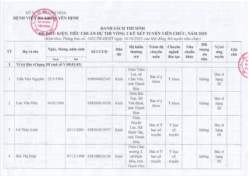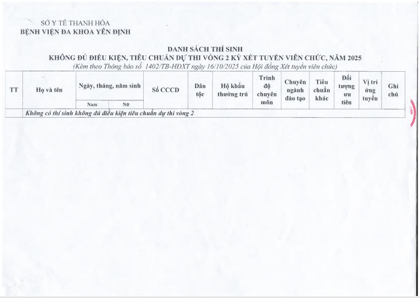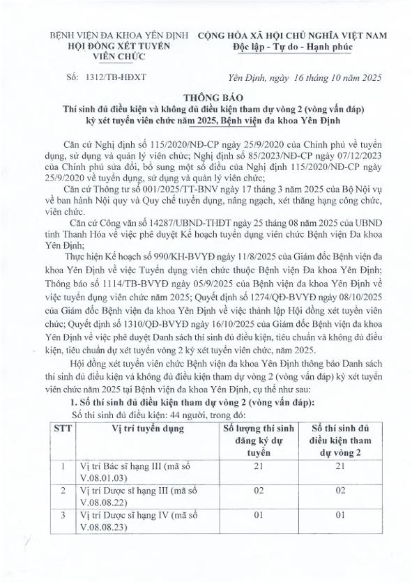 THÔNG BÁO Thí sinh đủ điều kiện và không đủ điều kiện tham dự vòng 2 (vòng vấn đáp) kỳ thi xét tuyển viên chức năm 2025, Bệnh viện đa khoa Yên Định
