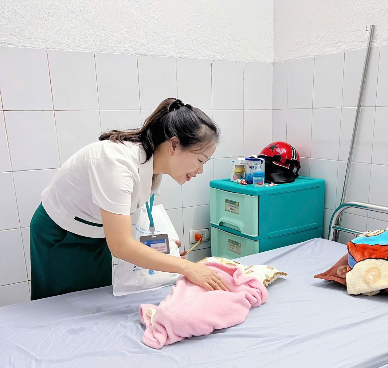 Hình ảnh: Nhân viên Phòng CTXH Bệnh viện tặng quà cho các bé sơ sinh tại khoa Sản